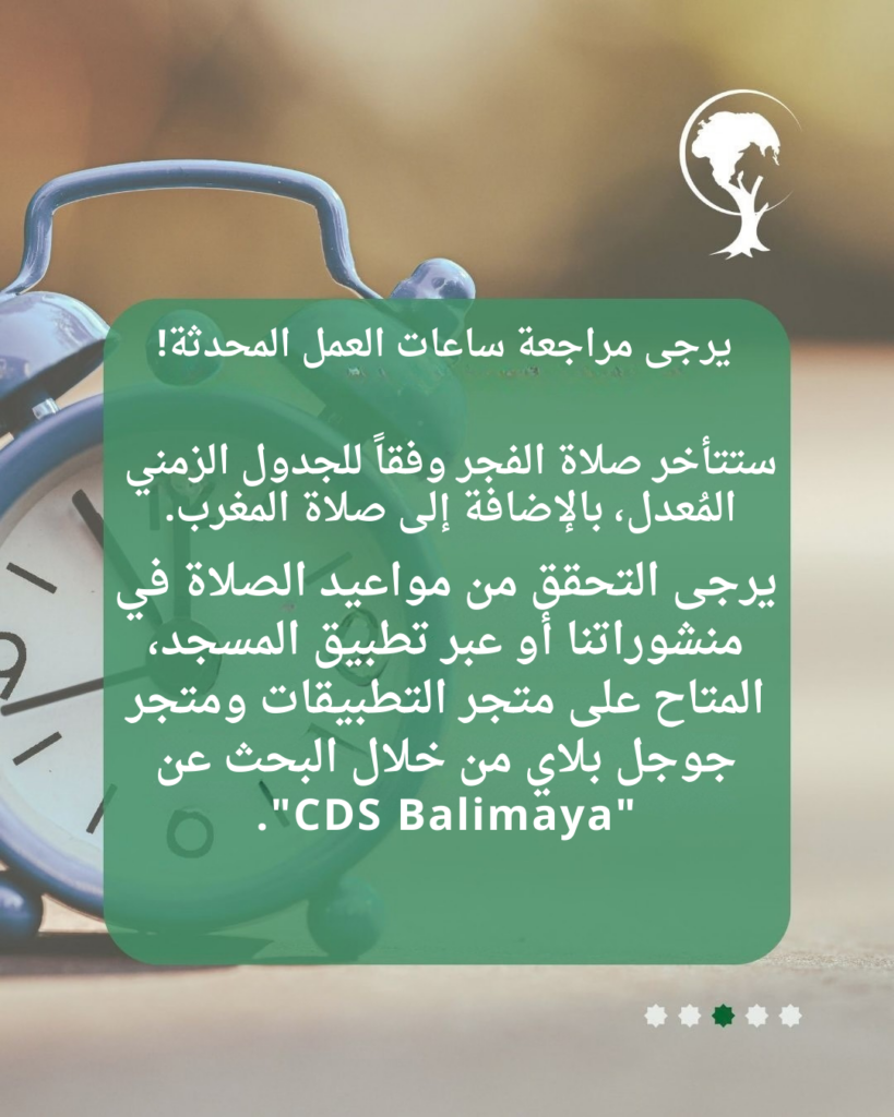 للاطلاع بسهولة على مواقيت الصلاة المحدثة، يمكنكم إيجادها في منشوراتنا أو تحميل تطبيق المسجد المتوفر على متجر التطبيقات ومتجر جوجل بلاي بالبحث عن "CDS Balimaya"، الرابط موجود في صفحتنا.