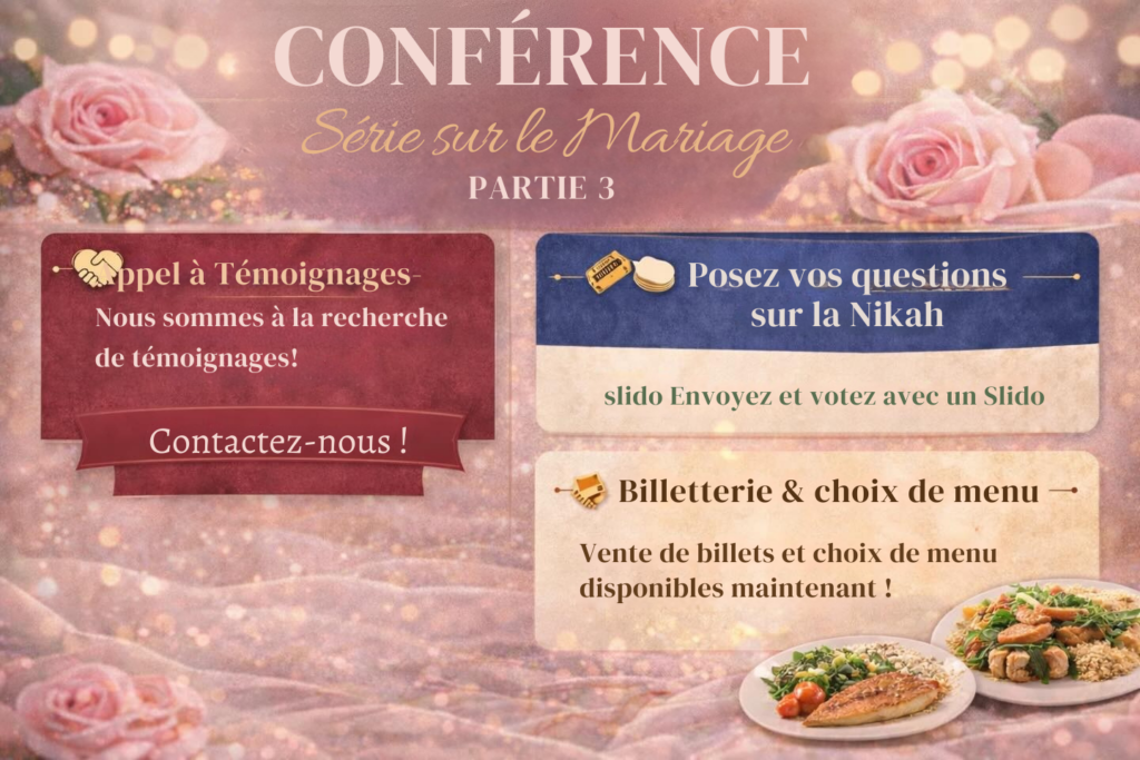 Nous avons le plaisir de vous informer que, dans le cadre de la troisième partie de la série de conférences sur le mariage, un lien Slido a été mis en place, comme lors de la précédente édition, pour vous permettre de poser vos questions relatives au nikah (mariage).